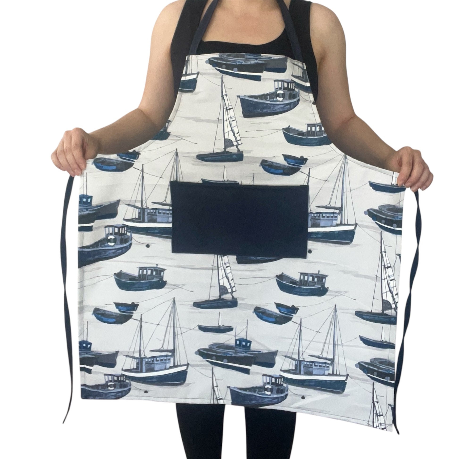 Bring coastal charm to your kitchen with this handmade apron and matching bread bag set, featuring an elegant navy boat print. The apron includes a practical solid navy front pocket and comfortable neck ties. The matching reusable tote can be used as a bread bag or shopping bag, making it perfect for daily errands or stylish kitchen organization.