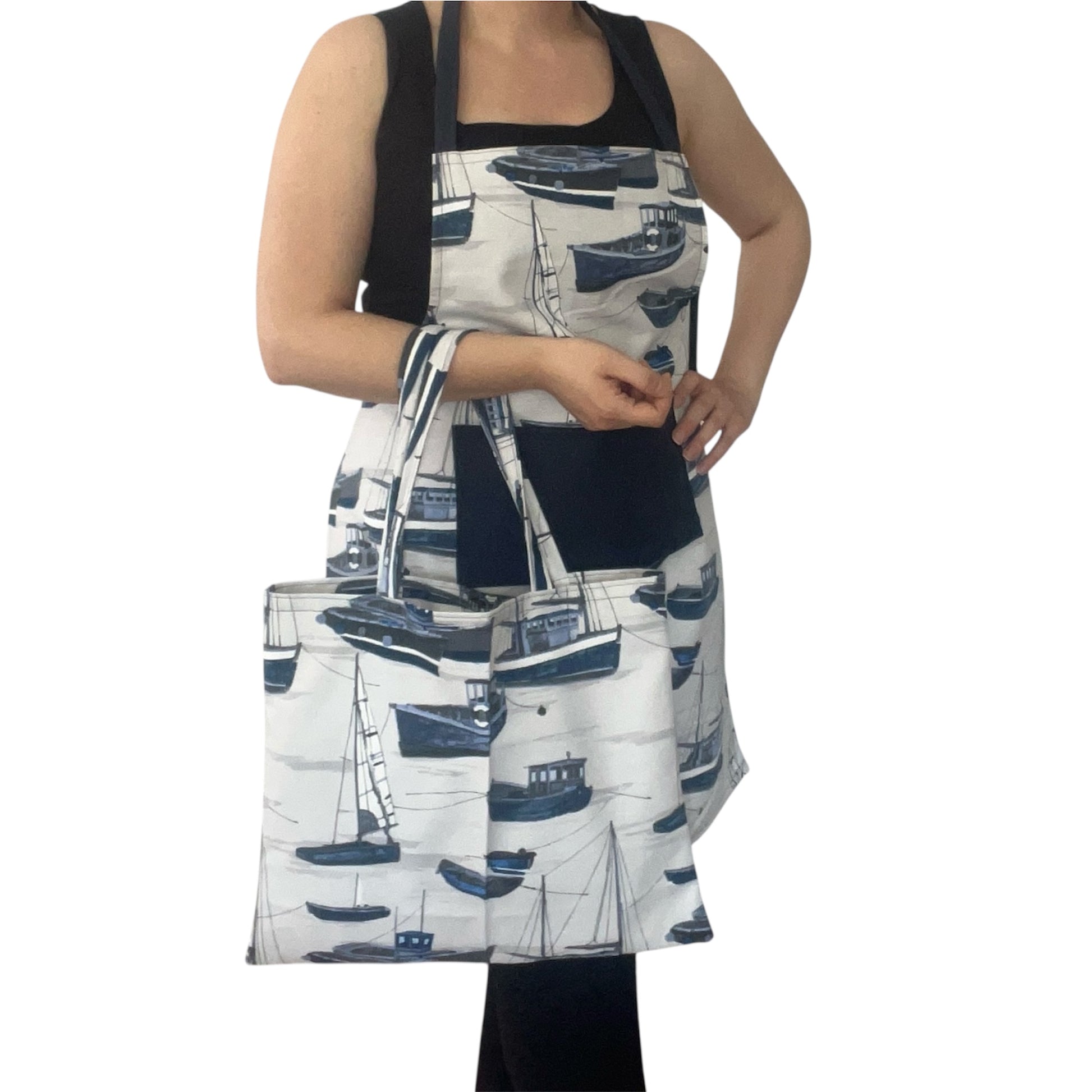 Handmade Nautical Apron & Matching Bread Bag Set – Navy Boat Print