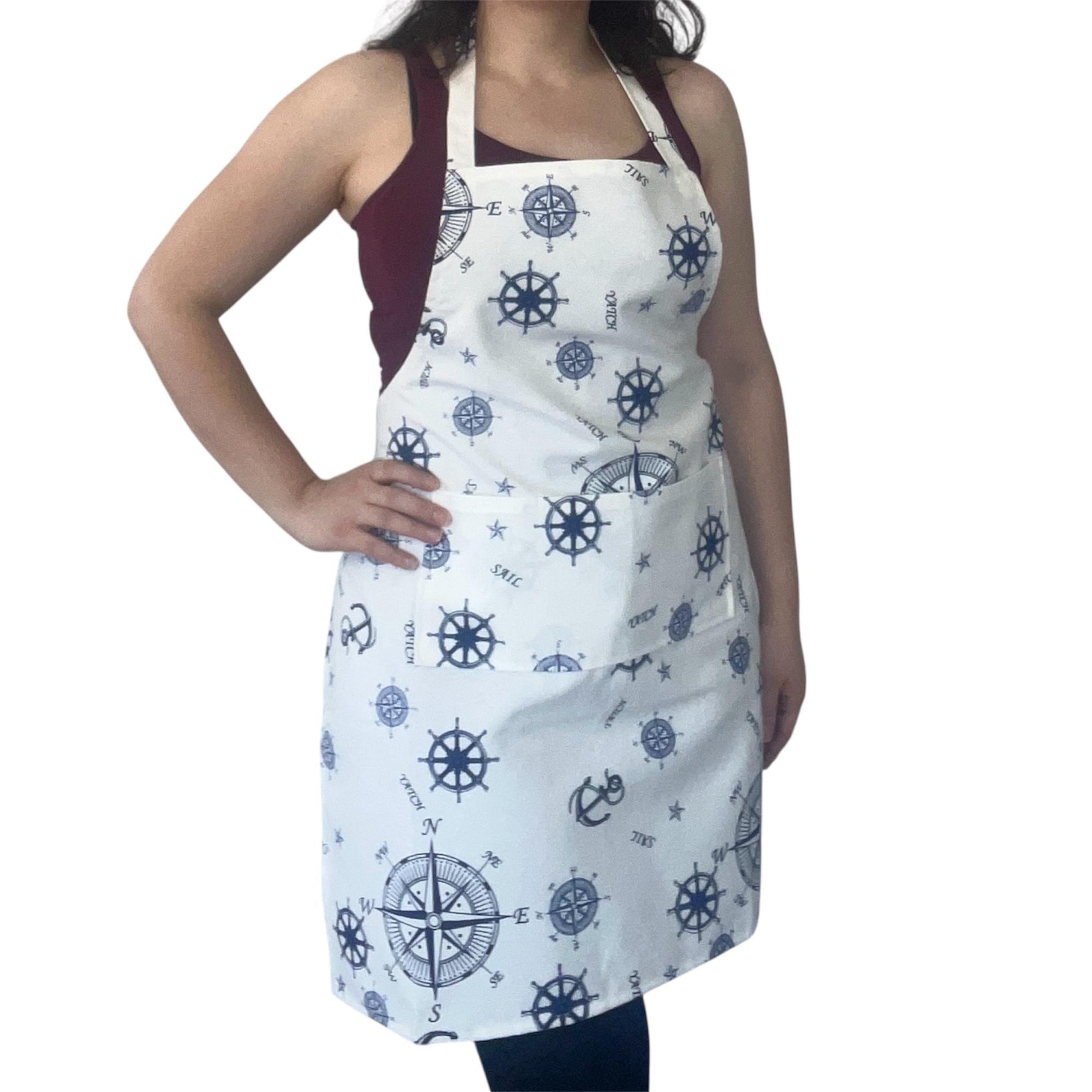 Handmade Nautical Apron – Compass & Ship Wheel Pattern | Water-Repellent, Stain-Resistant, Coastal Kitchen Gift