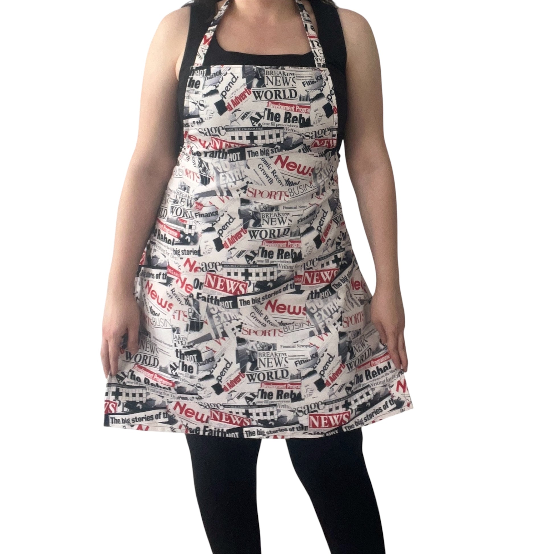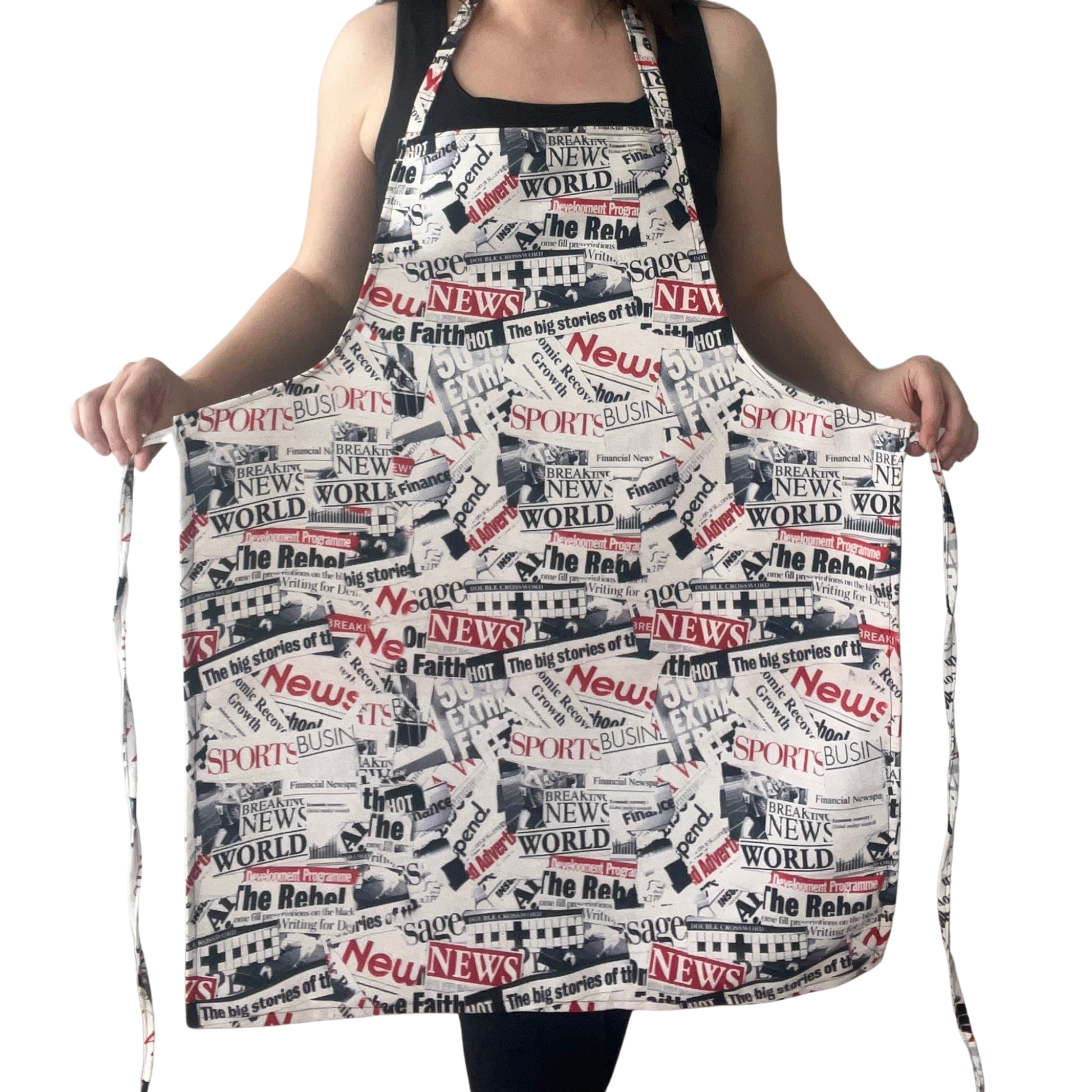 Step into the spotlight with this handmade newspaper-print apron, featuring a bold, all-over print of vintage-style headlines in red, black, and white. Perfect for those who love a touch of drama in their kitchen, studio, or workshop.