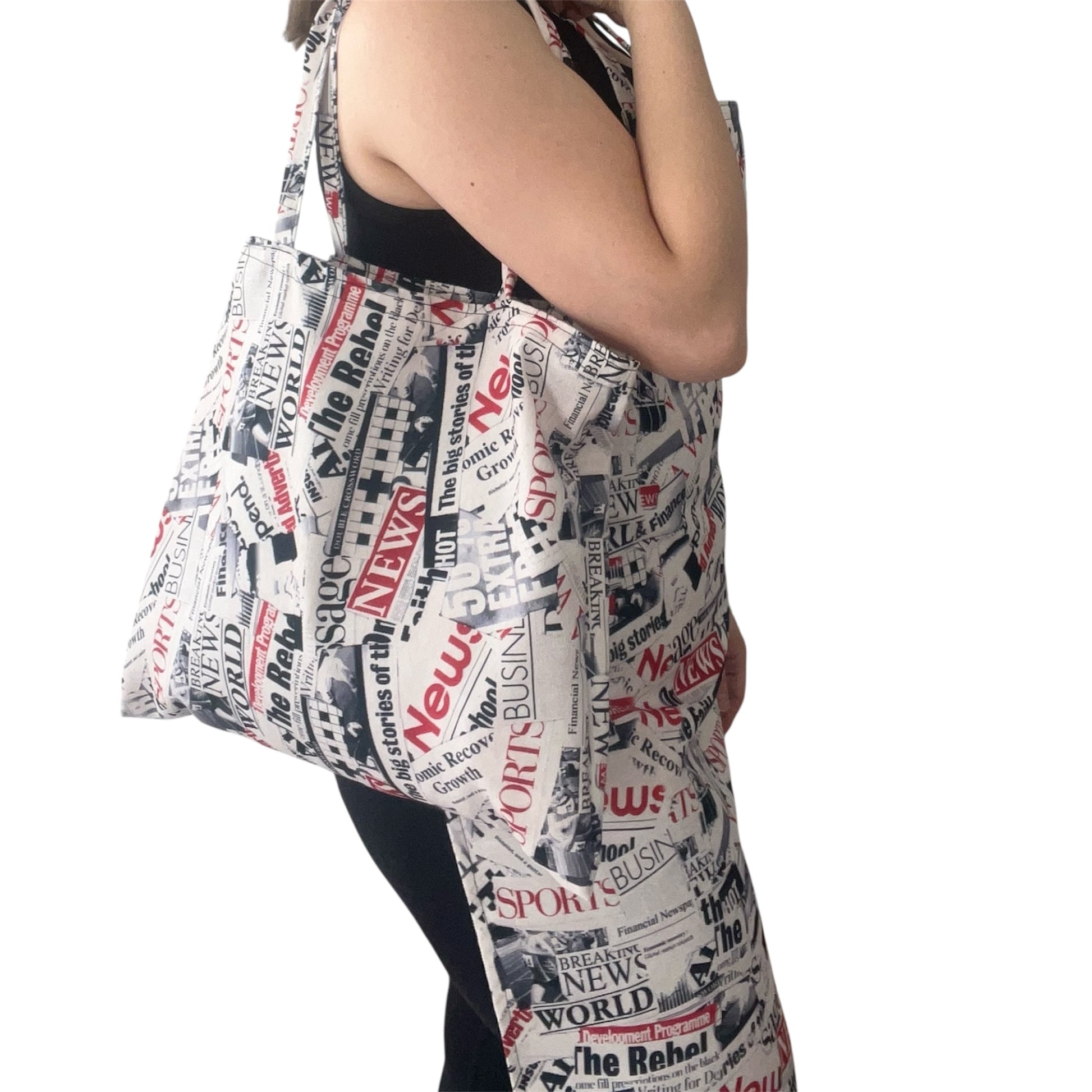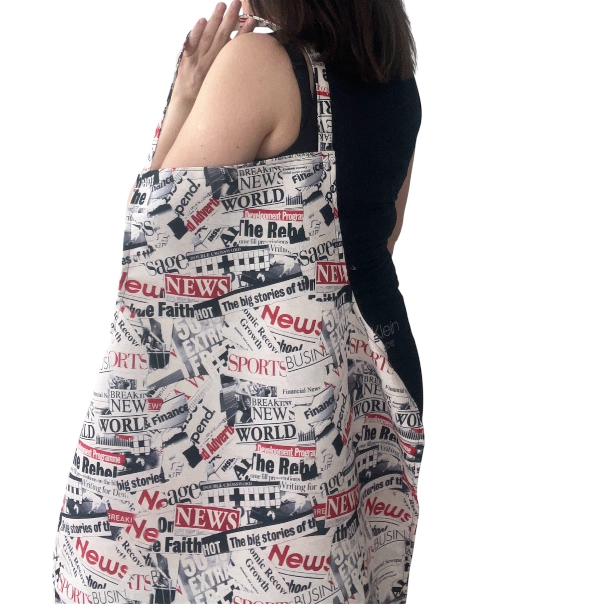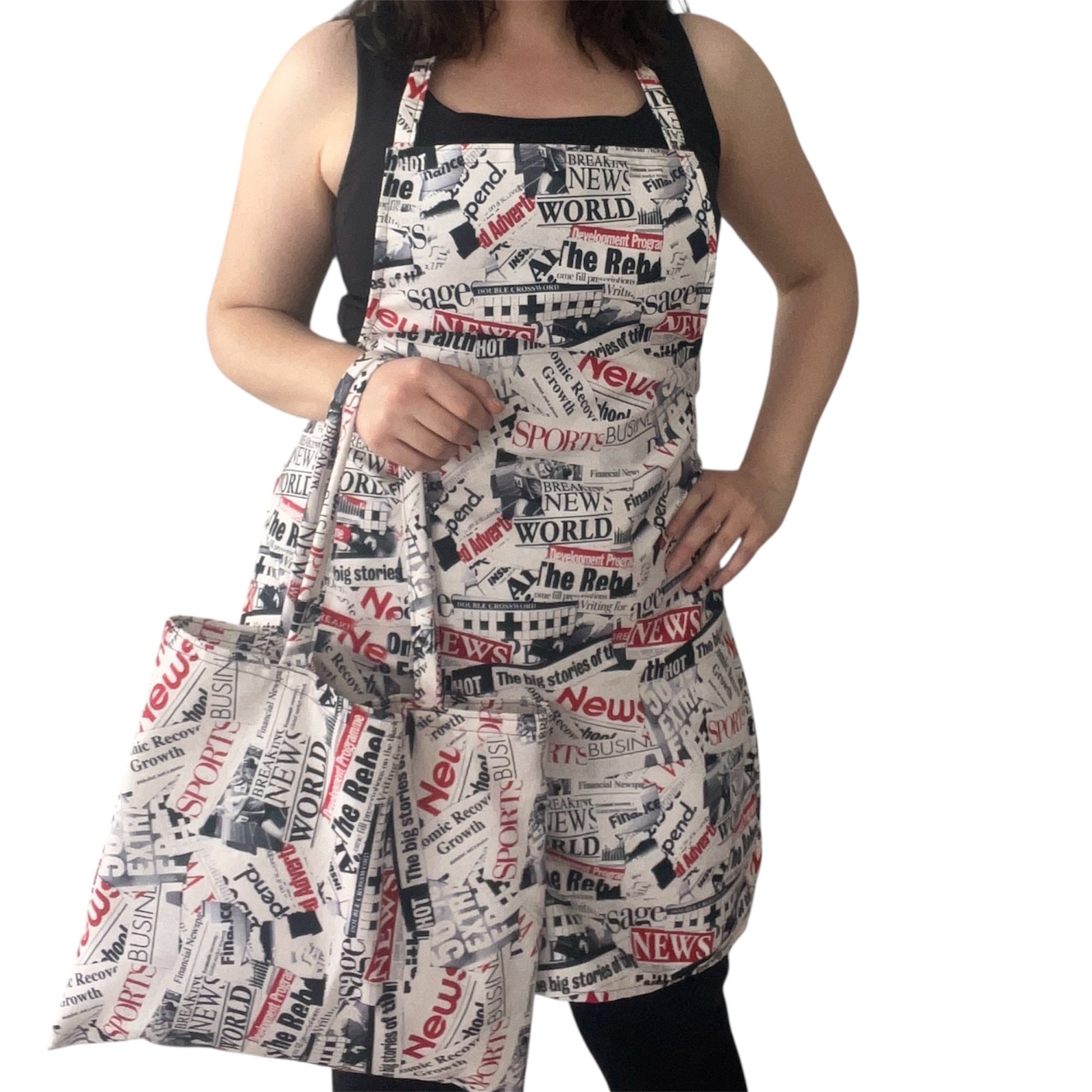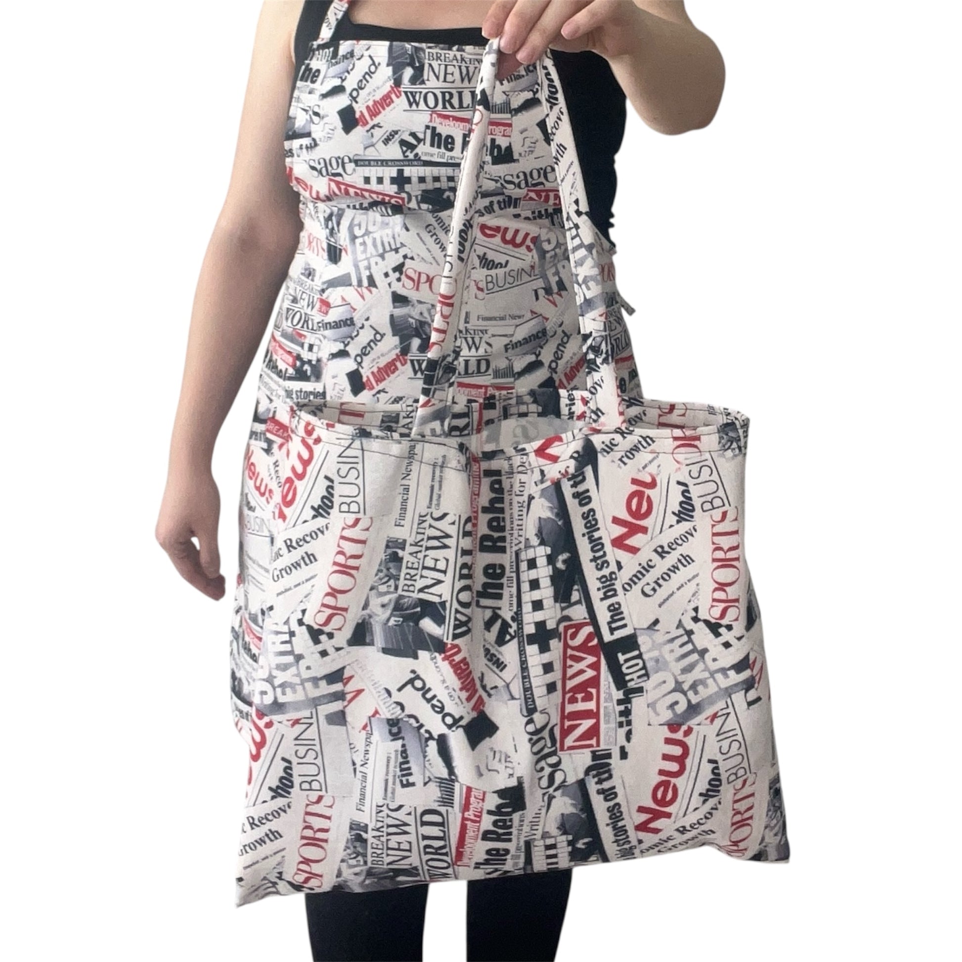 Handmade Newspaper Print Apron & Tote Bag Set – Bold Red, Black & White Headline Design, Lightweight, Washable, Unique Gift Idea