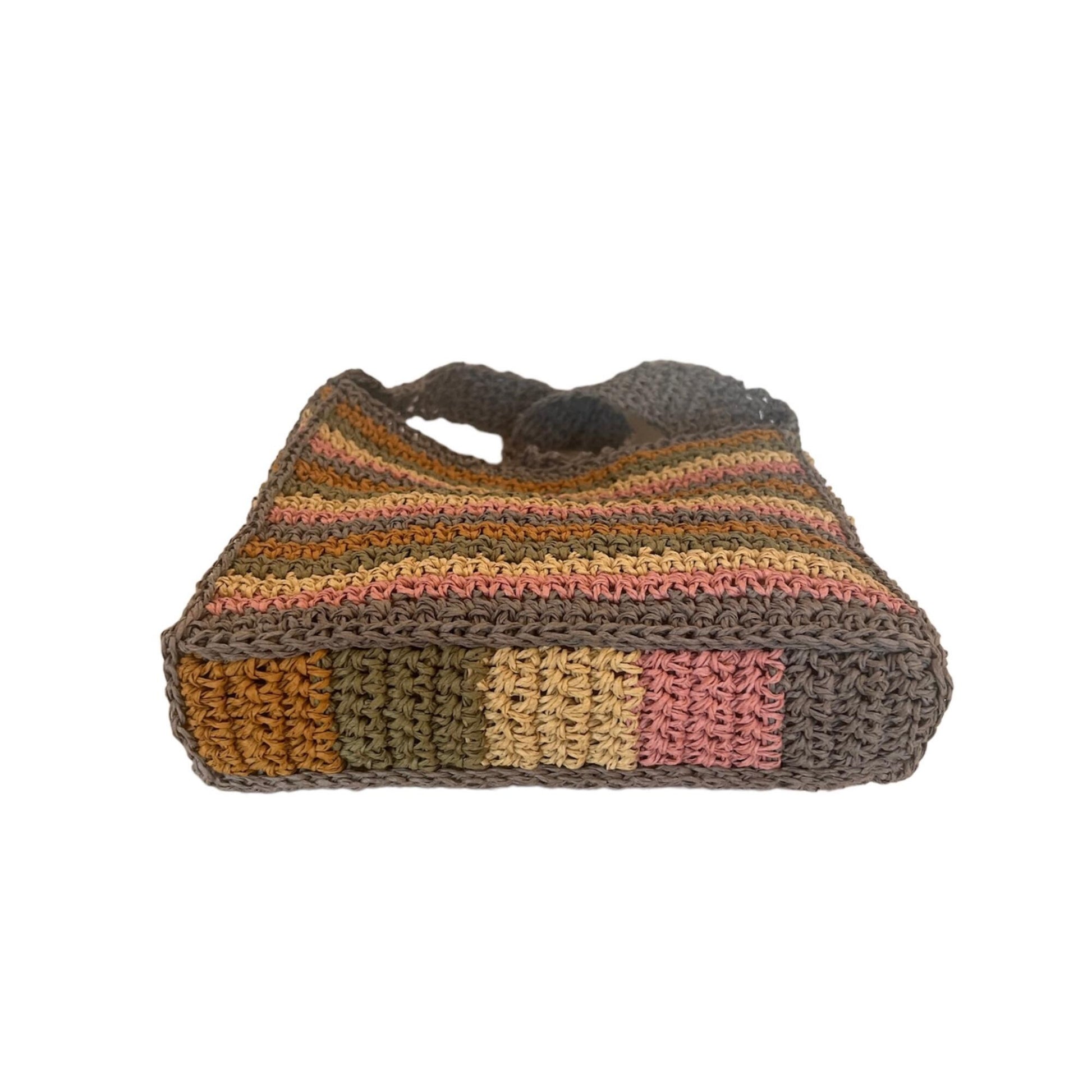 Bring artisanal charm to your everyday style with this Handmade Striped Crochet Shoulder Bag, featuring soft earthy pastel tones of brown, pink, mustard, and olive. Perfect for casual outings, market strolls, or as a thoughtful gift, this bag blends functionality with bohemian elegance.