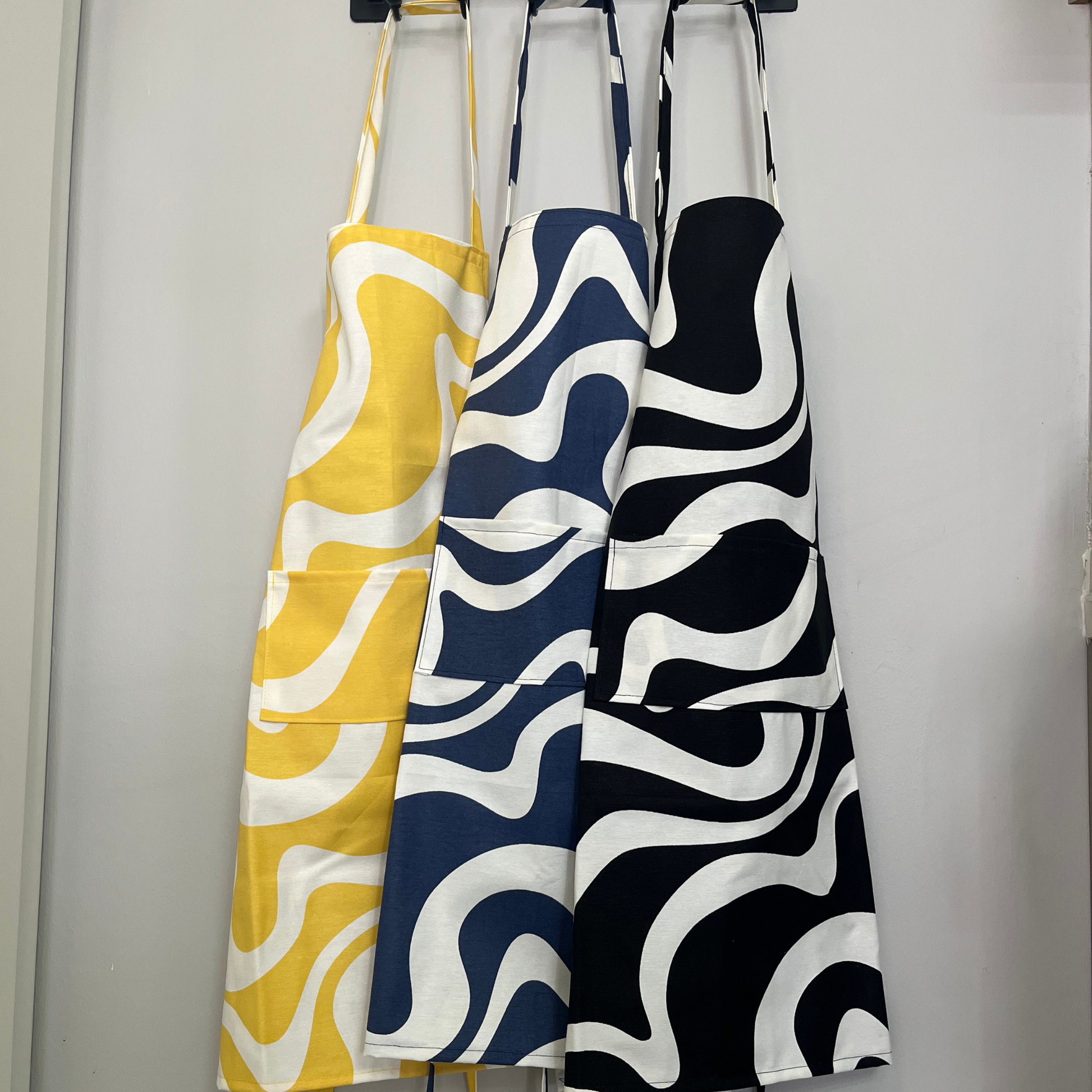 Add a pop of modern style to your kitchen with our handmade wavy print aprons. Available in vibrant yellow, elegant navy blue, and classic black, these aprons are perfect for cooking, baking, crafting, or gifting.