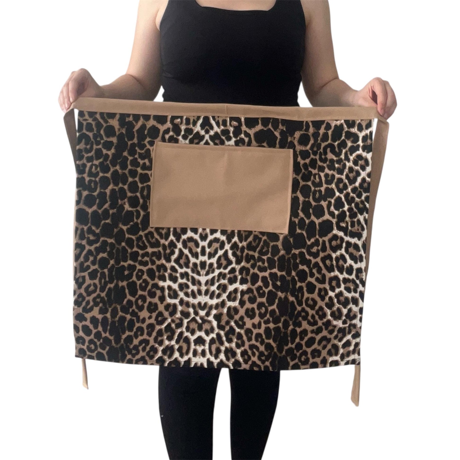 Add a bold touch to your kitchen routine with this handmade leopard print half apron. Featuring a practical beige front pocket and waistband, this apron combines style and functionality.