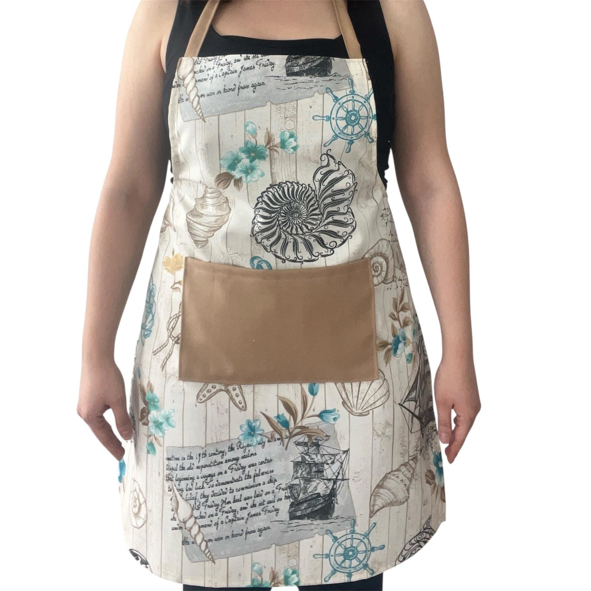 Sail into the kitchen with this handmade nautical-themed apron, blending coastal charm with everyday practicality. Featuring seashells, anchors, ship wheels, and ocean florals in soft blue and beige tones, this full-length apron offers both style and function.